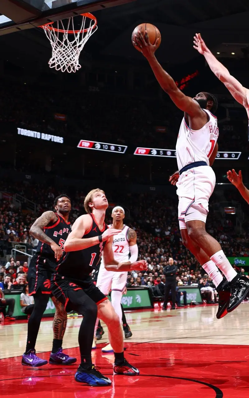 比赛中,哈登上脚地狱猫配色adidas Harden Vol.10。