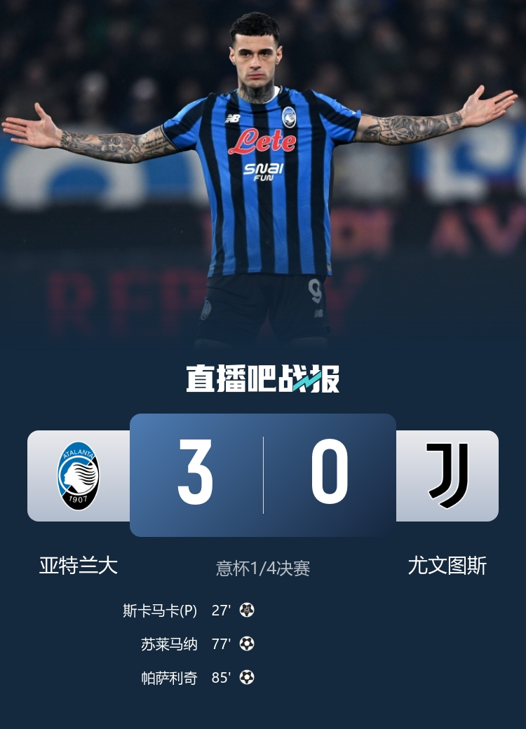 意大利杯八强,尤文图斯客场0-3不敌亚特兰大,布雷默送点,孔塞桑中框。