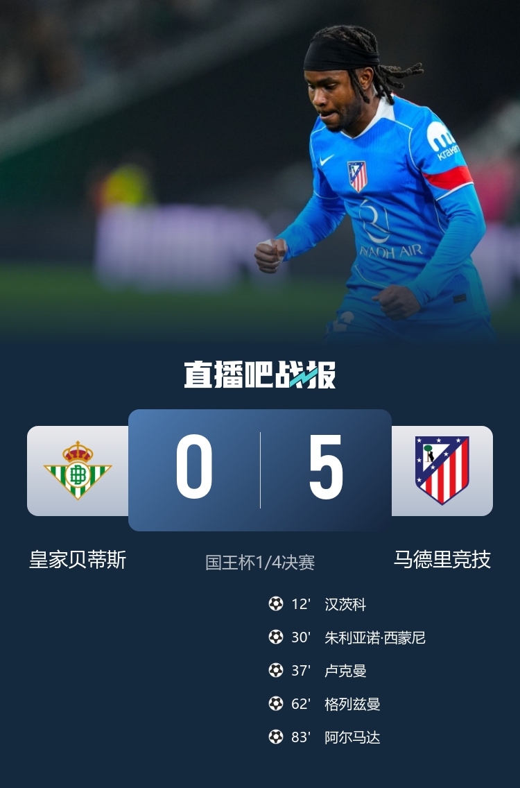 国王杯-马竞5-0贝蒂斯晋级4强 卢克曼首秀传射格子、小西蒙尼破门