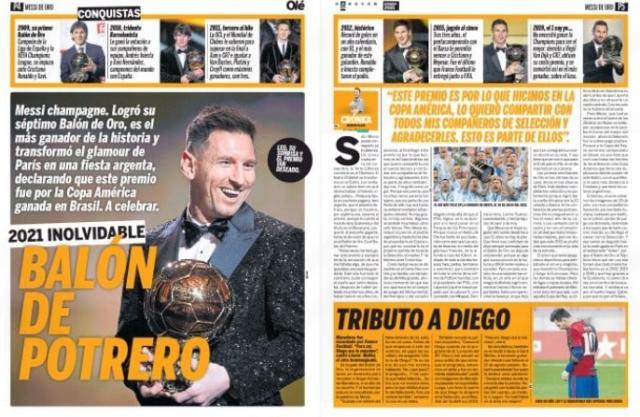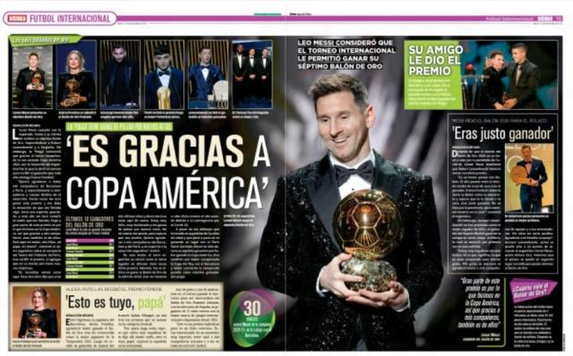 《民族报》把报道集中在国家队成绩帮助梅西赢得金球这个概念,该报认为,这个金球是梅西职业生涯一直缺少的——凭借在国家队的出色表现赢得的金球(文首配图)。