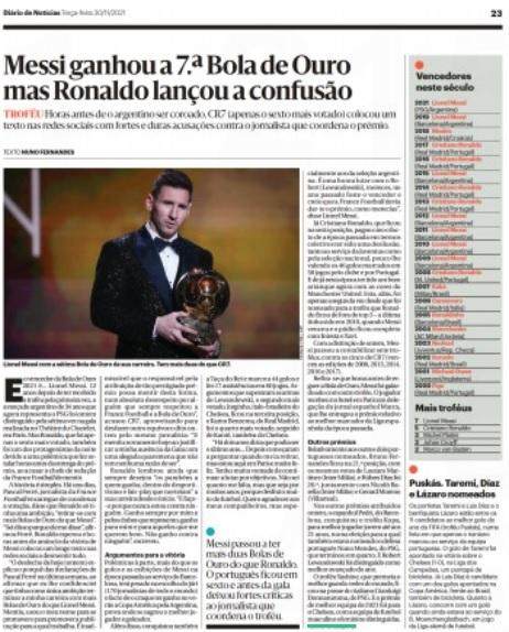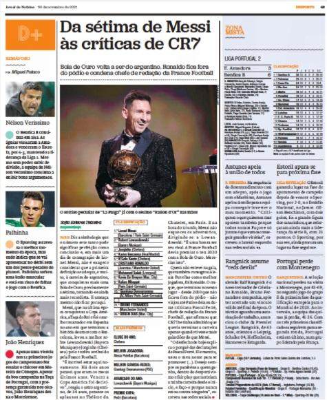 《新闻报》标题:“从梅西的第7座金球到C罗的批评”。