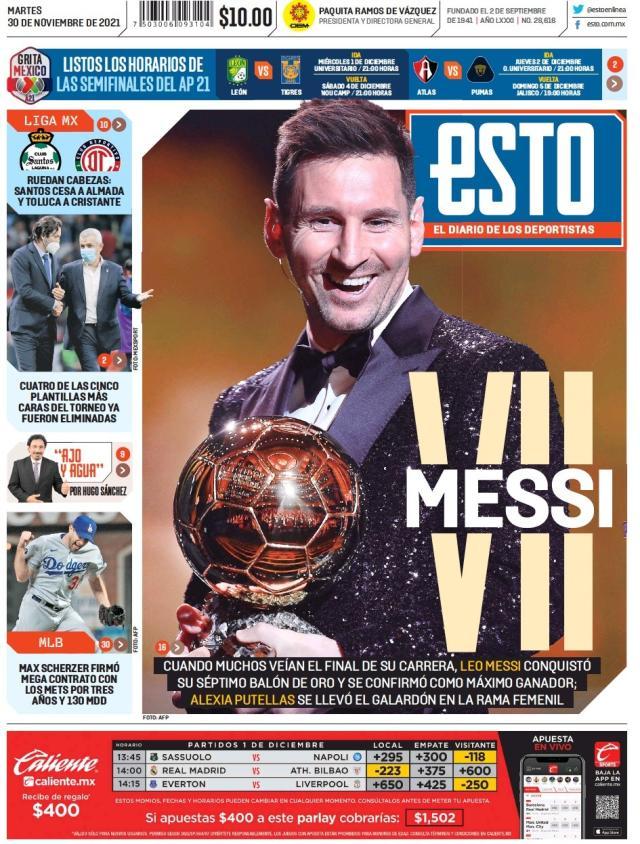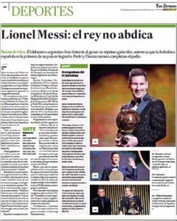 《这个报》是墨西哥的一家体育日报,他们的头版说“在人们认为梅西职业生涯走向终结的时候,他赢得了个人第7座金球,确认了最多金球得主的历史地位。”